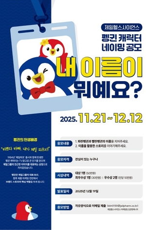 제일헬스사이언스는 브랜드 캐릭터 공식 네이밍 공모전을 진행하며 소비자와 더욱 긴밀하게 소통하기 위한 참여형 브랜드 활동을 본격화한다고 24일 밝혔다.이번 공모전은 임직원뿐 아니라 일반 소비자 누구나 기업의 공식 캐릭터에 적합한 이름과 스토리를 직접 제안할 수 있는 기회로 다양한 세대의 창의적 아이디어를 반영해 감성적이고 친근한 브랜드 아이덴티티를 완성하기 위한 전략의 일환이다.공모 기간은 12월 12일까지이며 응모는 자유 양식으로 작성해 지정된 이메일로 제출하면 된다. 시상 내역은 대상 1명(50만 원), 최우수상 1명(30만 원)